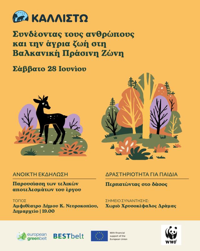 Δύο ξεχωριστές εκδηλώσεις για την παρουσίαση του έργου και των αποτελεσμάτων με τίτλο “Συνδέοντας τους ανθρώπους και την άγρια ζωή στη Βαλκανική Πράσινη Ζώνη” διοργανώνει η Περιβαλλοντική Οργάνωση Καλλιστώ στην περιοχή του Κάτω Νευροκοπίου, την Τετάρτη 25 Ιουνίου και το Σάββατο 28 Ιουνίου.