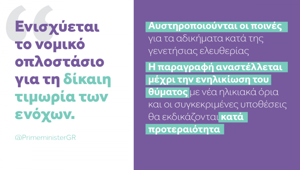 Οι πρωτοβουλίες που ανακοίνωσε ο πρωθυπουργός  σχετίζονται και με την πρόληψη τέτοιων φαινομένων όσο και την αυστηρότερη τιμωρία τους. «Στο πλαίσιο αυτό, λοιπόν, αλλάζει ο Ποινικός Κώδικας. Αυστηροποιούνται οι ποινές για τα αδικήματα κατά της γενετήσιας ελευθερίας. Σε ό,τι δε αφορά τους ανήλικους, η παραγραφή αναστέλλεται μέχρι την ενηλικίωση του θύματος, με νέα ηλικιακά όρια. Ενώ συγκεκριμένες υποθέσεις θα εκδικάζονται πια κατά προτεραιότητα» ανέφερε κατά τη συζήτηση ο Κυριάκος Μητσοτάκης.