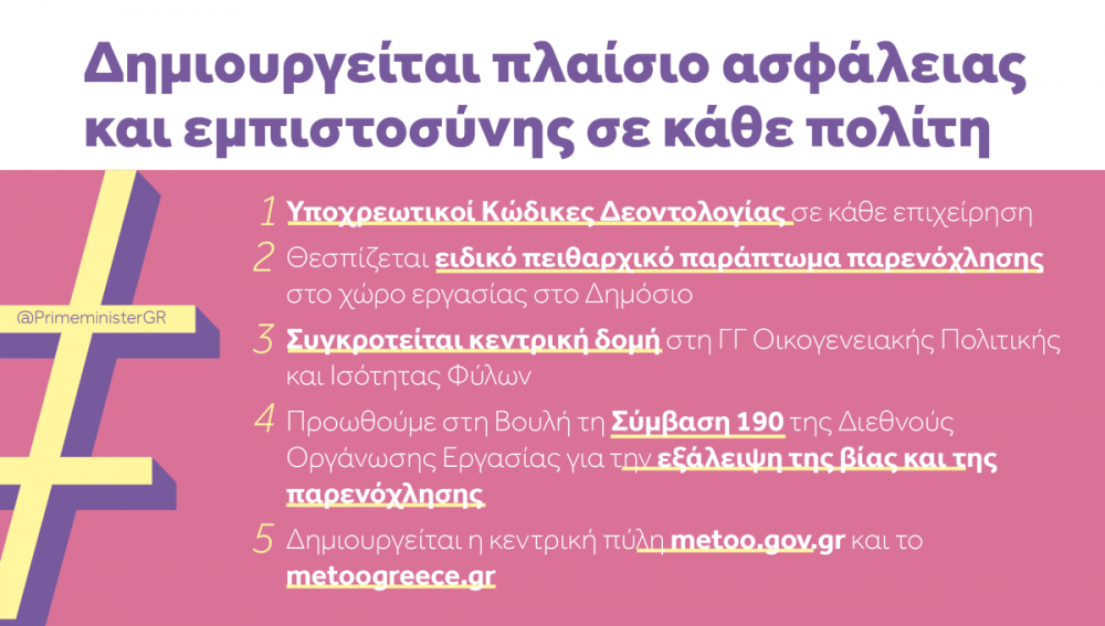 Τέταρτον, όπως ανέφερε ο πρωθυπουργός: «Συγκροτείται κεντρική δομή στη Γενική Γραμματεία Οικογενειακής Πολιτικής και Ισότητας των Φύλων για την αξιολόγηση αλλά κυρίως και για την εξωδικαστική επίλυση αυτής της κατηγορίας. Ενώ σύντομα θα έρθει προς κύρωση στη Βουλή η σύμβαση 190 της Διεθνούς Οργάνωσης Εργασίας, του ILO, για την εξάλειψη της βίας και της παρενόχλησης».