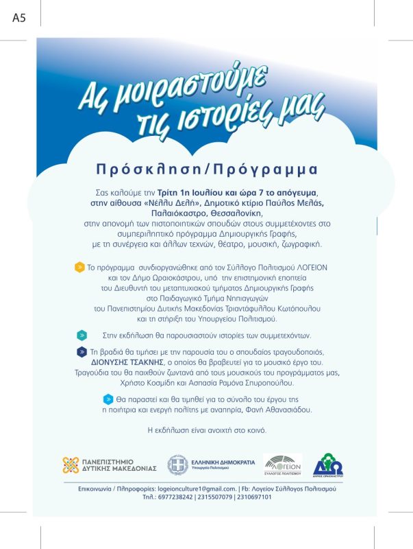 Σας καλούμε την Τρίτη, 1 Ιουλίου 2025, στις 7 το απόγευμα, στην Αίθουσα «Νέλλυ Δελή» στο Δημοτικό Κτίριο Παύλος Μελάς (Μακεδονικού Αγώνα 7, Παλαιόκαστρο) στην απονομή των πιστοποιητικών σπουδών στους συμμετέχοντες στο συμπεριληπτικό πρόγραμμα Δημιουργικής Γραφής με τη συνέργεια και άλλων τεχνών (θέατρο, μουσική, ζωγραφική), – για άτομα ΑμΕΑ και μη-, που συνδιοργανώθηκε από τον Σύλλογο Πολιτισμού «ΛΟΓΕΙΟΝ» και τον Δήμο Ωραιοκάστρου, υπό την επιστημονική εποπτεία του διευθυντή του μεταπτυχιακού τμήματος Δημιουργικής Γραφής στο Παιδαγωγικό