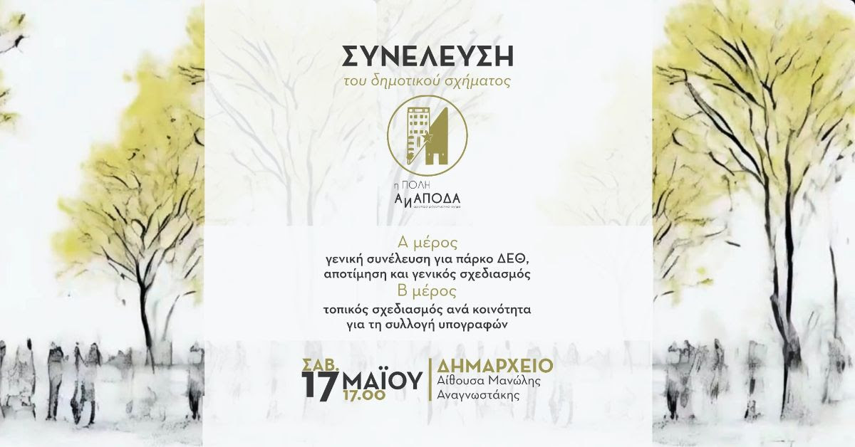 Αυτό το Σάββατο, 17 Μαΐου, στις 5:00 μμ, θα πραγματοποιηθεί τακτική γενική συνέλευση της Πόλης Ανάποδα στο Δημαρχείο Θεσσαλονίκης (αίθουσα Μανώλης Αναγνωστάκης). Βασικό θέμα της η συνέχιση του αγώνα για τη δημιουργία Μητροπολοτικού Πάρκου στον χώρο της ΔΕΘ, μέσω συλλογής υπογραφών με σκοπό τη διενέργεια δημοψηφίσματος.