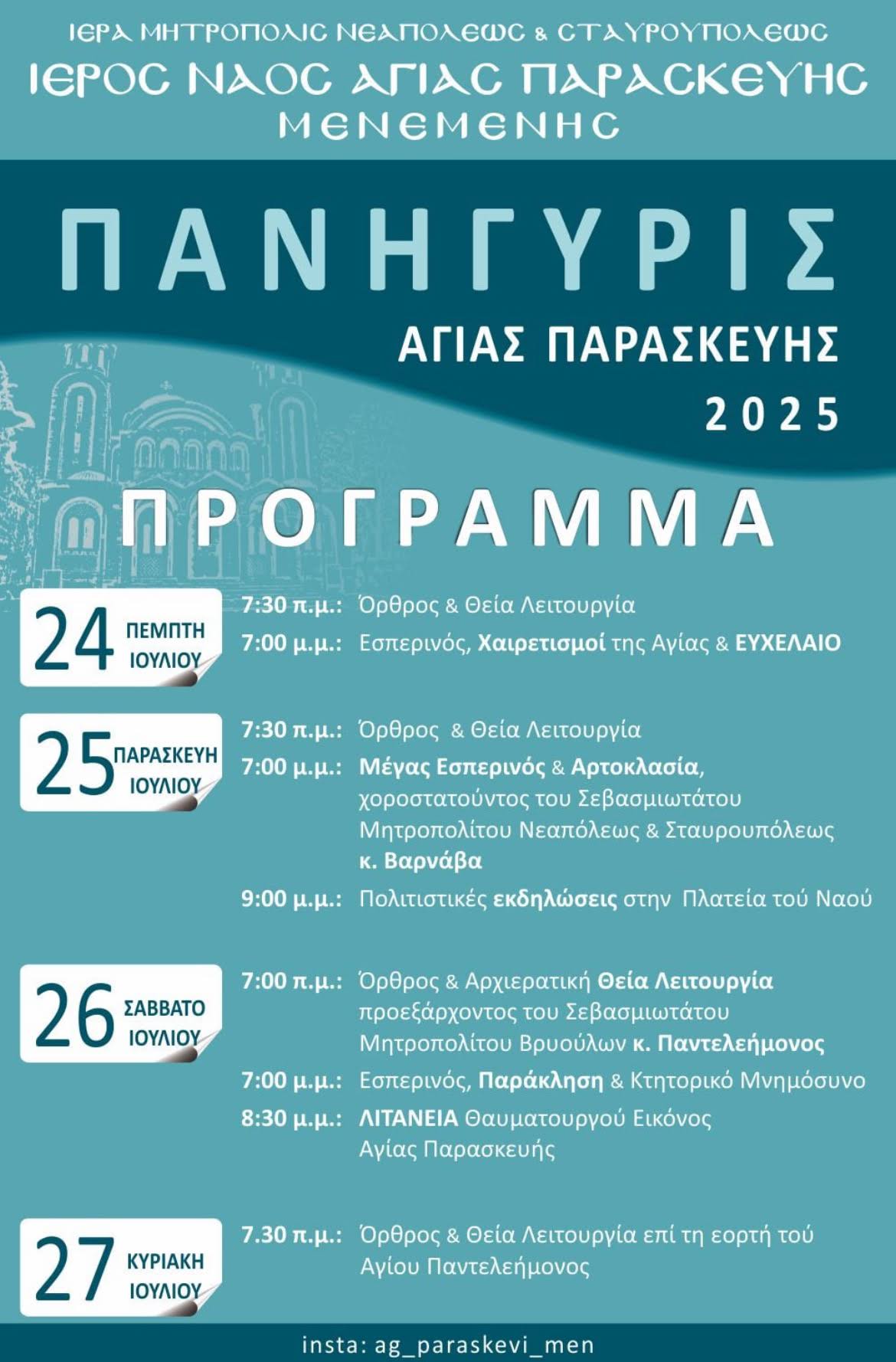Με κάθε μεγαλοπρέπεια η Μενεμένη της Δυτικής Θεσσαλονίκης ετοιμάζεται να τιμήσει το Σάββατο 26 Ιουλίου 2025 την πολιούχο και προστάτιδά της Αγία Παρασκευή στον ομώνυμο Ιερό Ναό στην πλατεία της Μενεμένης. Οι εορταστικές εκδηλώσεις θα αρχίσουν την Πέμπτη 24 Ιουλίου και θα κορυφωθούν το Σάββατο 26 Ιουλίου 2025 με τη λιτάνευση της Εικόνας της Αγίας.
