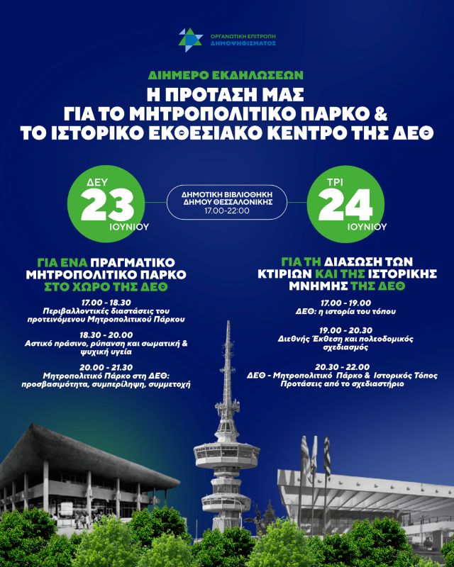 Η Οργανωτική Επιτροπή του Δημοψηφίσματος διοργανώνει στις 23 και 24 Ιουνίου 2025 ένα διήμερο θεματικών εκδηλώσεων με τίτλο «Η πρότασή μας για το Μητροπολιτικό Πάρκο & το Ιστορικό Εκθεσιακό Κέντρο της ΔΕΘ», με στόχο την ανάδειξη κρίσιμων πτυχών του δημόσιου διαλόγου για το μέλλον της ΔΕΘ και της Θεσσαλονίκης. Οι εκδηλώσεις θα