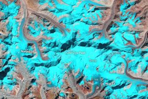 Οι παρακάτω εικόνες ψευδοχρωμάτων δείχνουν τους παγετώνες Nanpa La και Nup La, περίπου 50 χιλιόμετρα βορειοδυτικά του όρους Έβερεστ, τον χειμώνα στις 17 Ιανουαρίου 2021 (βασική εικόνα κειμένου) και το φθινόπωρο στις 13 Οκτωβρίου 2020 (εικόνα εσωτερική). Οι εικόνες έχουν ληφθεί από το όργανο OLI (Operational Land Imager) του δορυφόρου Landsat 8 χρησιμοποιώντας τις μπάντες 7-5-4. Σε αυτές τις εικόνες, οι συχνότητες στο φάσμα υπερύθρων βραχέων κυμάτων (SWIR) συνδυάζονται με συχνότητες στο ορατό φάσμα, για να διαφοροποιηθούν καλύτερα οι περιοχές που έχουν χιόνι (φωτεινότερο μπλε), πάγο (σκούρο μπλε) και λιωμένο νερό (σκουρότερο μπλε). Οι βράχοι έχουν καφέ χρώμα, ενώ η βλάστηση πράσινο. Οι μαύρες περιοχές είναι σκιές.