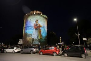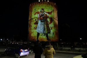 Στην επιφάνεια του Λευκού Πύργου ζωντάνεψε η μορφή του «Έλληνα Αγωνιστή» από το έργο του Ιταλού ζωγράφου Λουντοβίκο Λιπαρίνι, αποτυπώθηκαν οι στίχοι: «Η δύναμή σου πέλαγο, η θέλησή μου βράχος» από τους Ελεύθερους Πολιορκημένους του Διονυσίου Σολωμού, ενώ προβλήθηκαν οι χρονολογίες «1821-2021″ και με φόντο τη γαλανόλευκη σημαία το μήνυμα «200 χρόνια από την Ελληνική Επανάσταση».