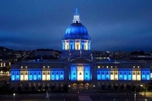 Τα φωταγωγημένα κτίρια σε γαλανόλευκα χρώματα