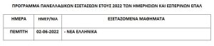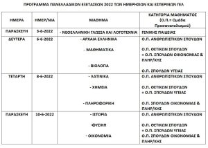 Α. Πρόγραμμα Πανελλαδικών Εξετάσεων 2022 των Ημερήσιων και Εσπερινών ΓΕΛ: