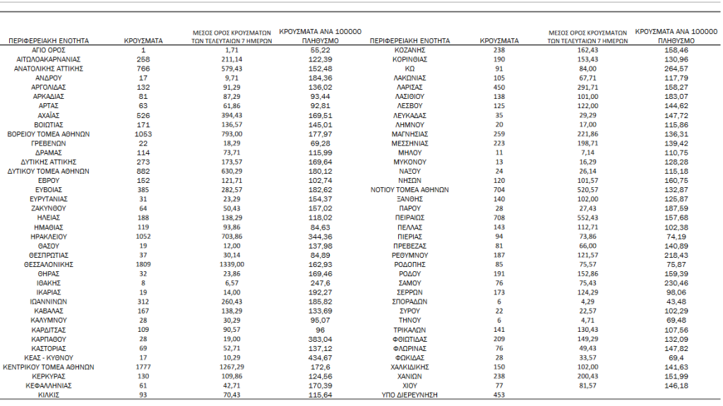Τα νέα εργαστηριακά επιβεβαιωμένα κρούσματα της νόσου που καταγράφηκαν τις τελευταίες 24 ώρες είναι 17.176, εκ των οποίων 45 εντοπίστηκαν κατόπιν ελέγχων στις πύλες εισόδου της χώρας. Ο συνολικός αριθμός των κρουσμάτων ανέρχεται σε 2.438.872 (ημερήσια μεταβολή +0.7%), εκ των οποίων 49.5% άνδρες. Με βάση τα επιβεβαιωμένα κρούσματα των τελευταίων 7 ημερών,