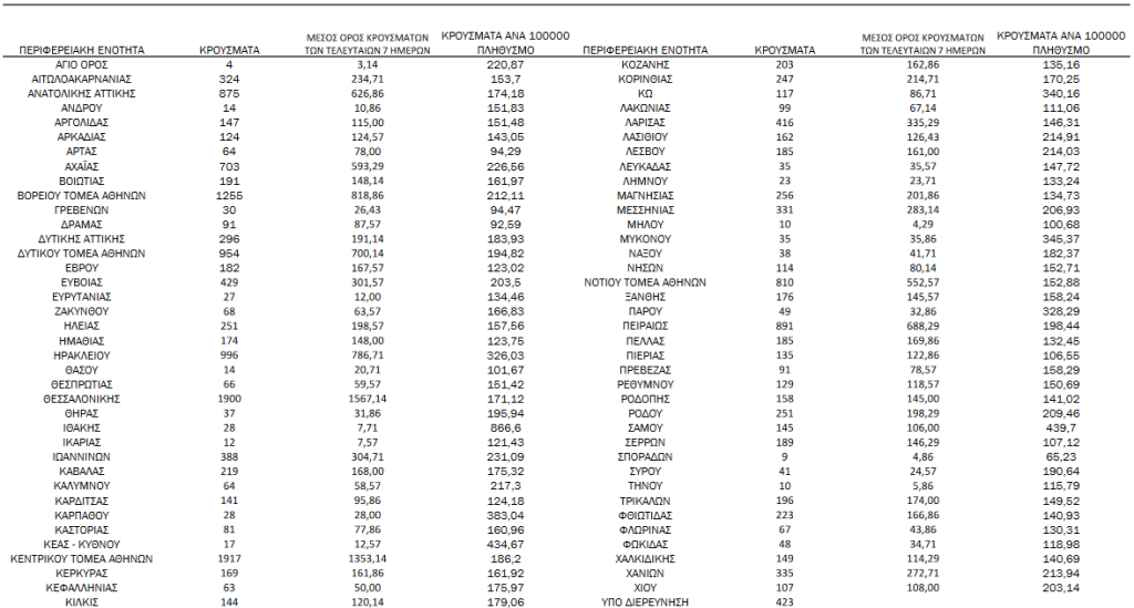 Τα νέα εργαστηριακά επιβεβαιωμένα κρούσματα της νόσου που καταγράφηκαν τις τελευταίες 24 ώρες είναι 19.623, εκ των οποίων 44 εντοπίστηκαν κατόπιν ελέγχων στις πύλες εισόδου της χώρας. Ο συνολικός αριθμός των κρουσμάτων ανέρχεται σε 2.336.615 (ημερήσια μεταβολή +0.9%), εκ των οποίων 49.6% άνδρες. Με βάση τα επιβεβαιωμένα κρούσματα των τελευταίων 7 ημερών,