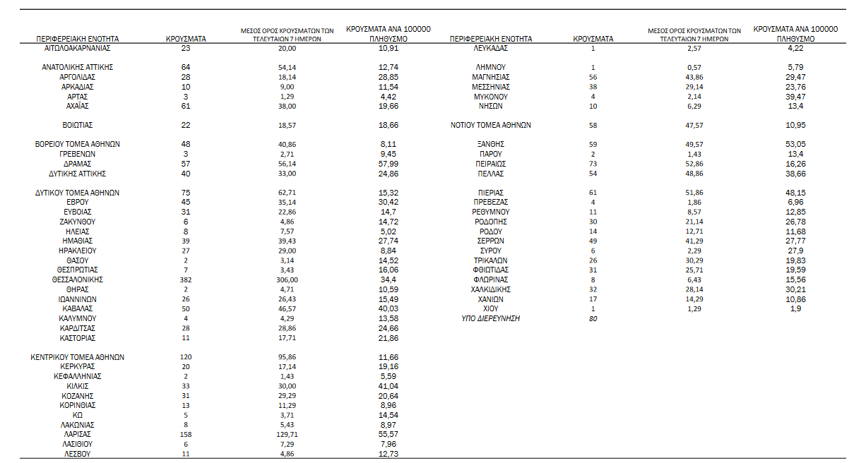 Τα νέα εργαστηριακά επιβεβαιωμένα κρούσματα της νόσου που καταγράφηκαν τις τελευταίες 24 ώρες είναι 2.249, εκ των οποίων 6 εντοπίστηκαν κατόπιν ελέγχων στις πύλες εισόδου της χώρας. Ο συνολικός αριθμός των κρουσμάτων ανέρχεται σε 671.040 (ημερήσια μεταβολή +0.3%), εκ των οποίων 50.9% άνδρες. Με βάση τα επιβεβαιωμένα κρούσματα των τελευταίων 7 ημερών, 114 θεωρούνται σχετιζόμενα με ταξίδι από το εξωτερικό και 3.126 είναι σχετιζόμενα με ήδη γνωστό κρούσμα.