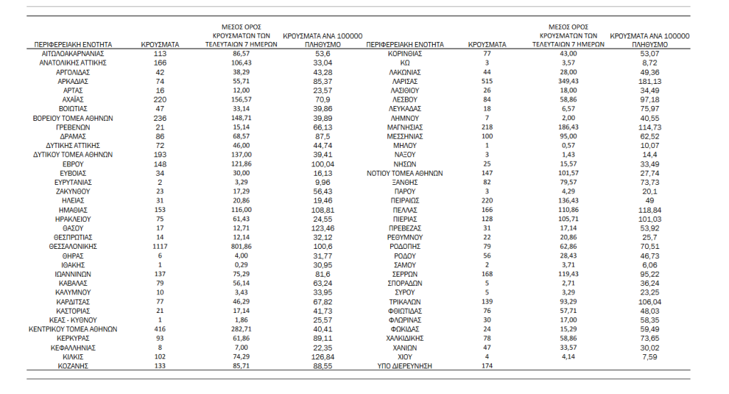 Τα νέα εργαστηριακά επιβεβαιωμένα κρούσματα της νόσου που καταγράφηκαν τις τελευταίες 24 ώρες είναι 6.808 , εκ των οποίων 12 εντοπίστηκαν κατόπιν ελέγχων στις πύλες εισόδου της χώρας. Ο συνολικός αριθμός των κρουσμάτων ανέρχεται σε 767.376 (ημερήσια μεταβολή +0.9%), εκ των οποίων 50.8% άνδρες.1 Με βάση τα επιβεβαιωμένα κρούσματα των τελευταίων 7 ημερών, 148 θεωρούνται σχετιζόμενα με ταξίδι από το εξωτερικό και 2.589 είναι σχετιζόμενα με ήδη γνωστό κρούσμα.