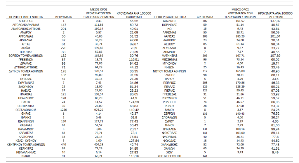 Τα νέα εργαστηριακά επιβεβαιωμένα κρούσματα της νόσου που καταγράφηκαν τις τελευταίες 24 ώρες είναι 6.950 , εκ των οποίων 15 εντοπίστηκαν κατόπιν ελέγχων στις πύλες εισόδου της χώρας. Ο συνολικός αριθμός των κρουσμάτων ανέρχεται σε 838.824 (ημερήσια μεταβολή +0.8%), εκ των οποίων 50.7% άνδρες. Με βάση τα επιβεβαιωμένα κρούσματα των τελευταίων 7 ημερών, 105 θεωρούνται σχετιζόμενα με ταξίδι από το εξωτερικό και 2.727 είναι σχετιζόμενα με ήδη γνωστό κρούσμα.
