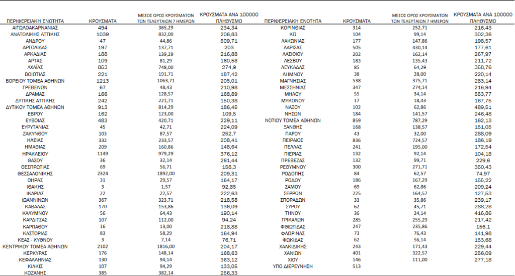Τα νέα εργαστηριακά επιβεβαιωμένα κρούσματα της νόσου που καταγράφηκαν τις τελευταίες 24 ώρες είναι 22.694, εκ των οποίων 37 εντοπίστηκαν κατόπιν ελέγχων στις πύλες εισόδου της χώρας. Ο συνολικός αριθμός των κρουσμάτων ανέρχεται σε 2.658.296 (ημερήσια μεταβολή +0.9%), εκ των οποίων 49.3% άνδρες. Με βάση τα επιβεβαιωμένα κρούσματα των τελευταίων 7 ημερών, 219