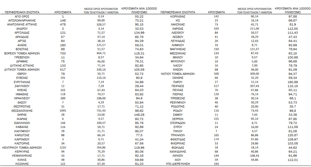 Τα νέα εργαστηριακά επιβεβαιωμένα κρούσματα της νόσου(άτομα) που καταγράφηκαν τις τελευταίες 24 ώρες ήταν 10.005. Ο συνολικός αριθμός των ατόμων που νόσησαν ανέρχεται σε 3.252.248 (ημερήσια μεταβολή +0.3%), εκ των οποίων 49.0% άνδρες.