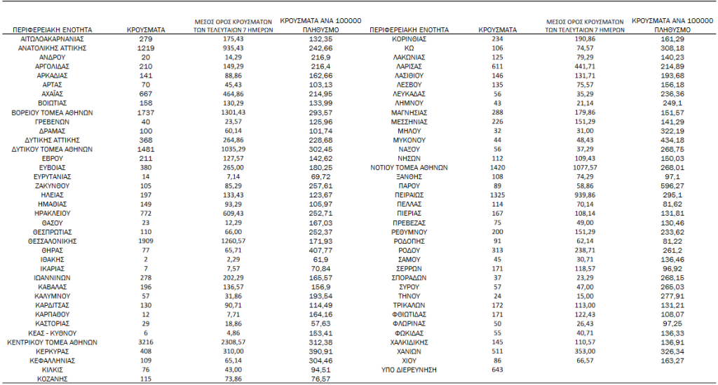 Τα νέα εργαστηριακά επιβεβαιωμένα κρούσματα της νόσου(άτομα) που καταγράφηκαν τις τελευταίες 24 ώρες ήταν 19.303. Ο συνολικός αριθμός των ατόμων που νόσησαν ανέρχεται σε 3.774.377 (ημερήσια μεταβολή +0.5%), εκ των οποίων 48.5% άνδρες.