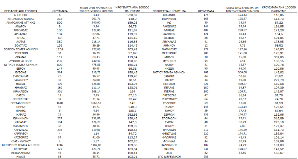 Τα νέα εργαστηριακά επιβεβαιωμένα κρούσματα της νόσου(άτομα) που καταγράφηκαν τις τελευταίες 24 ώρες ήταν 15.690. Ο συνολικός αριθμός των ατόμων που νόσησαν ανέρχεται σε 3.195.887 (ημερήσια μεταβολή +0.5%), εκ των οποίων 49.0% άνδρες. Ο αριθμός πιθανών νέων επαναλοιμώξεων που καταγράφηκαν τις τελευταίες 24 ώρες ήταν 362 ενώ από την αρχή της πανδημίας SARS-CoV-2 ο συνολικός αριθμός εκτιμάται σε 119.314 (3.6% του συνολικού αριθμού των θετικών αποτελεσμάτων).