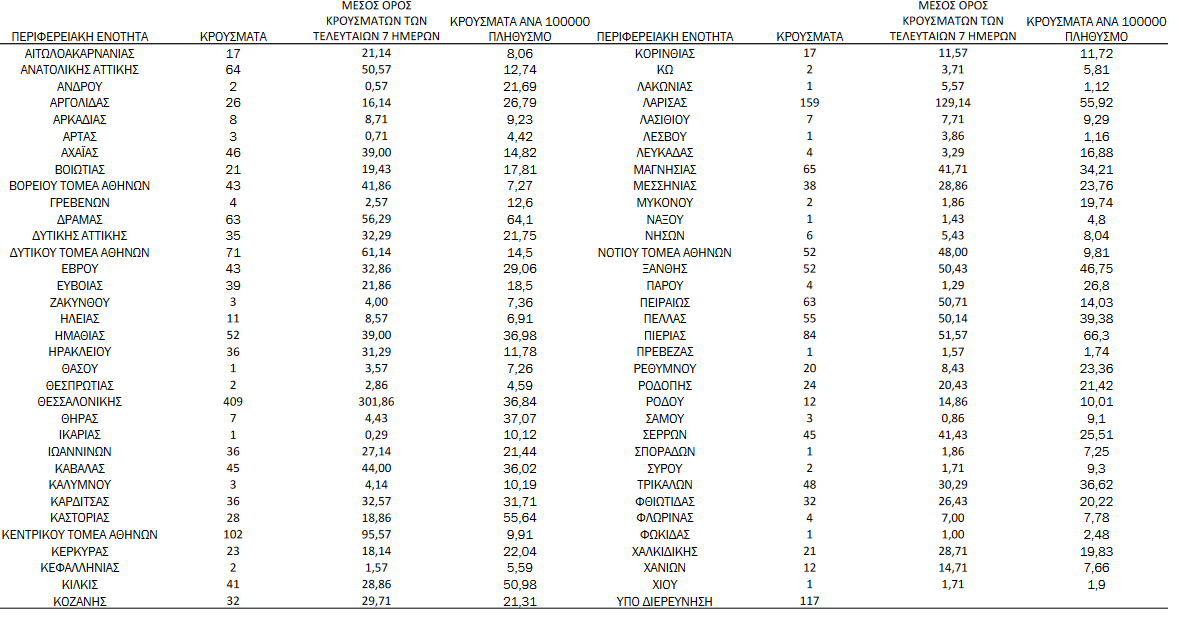Τα νέα εργαστηριακά επιβεβαιωμένα κρούσματα της νόσου που καταγράφηκαν τις τελευταίες 24 ώρες είναι 2.331, εκ των οποίων 8 εντοπίστηκαν κατόπιν ελέγχων στις πύλες εισόδου της χώρας. Ο συνολικός αριθμός των κρουσμάτων ανέρχεται σε 668.811 (ημερήσια μεταβολή +0.3%), εκ των οποίων 50.9% άνδρες.1 Με βάση τα επιβεβαιωμένα κρούσματα των τελευταίων 7 ημερών, 112 θεωρούνται σχετιζόμενα με ταξίδι από το εξωτερικό και 2.984 είναι σχετιζόμενα με ήδη γνωστό κρούσμα.