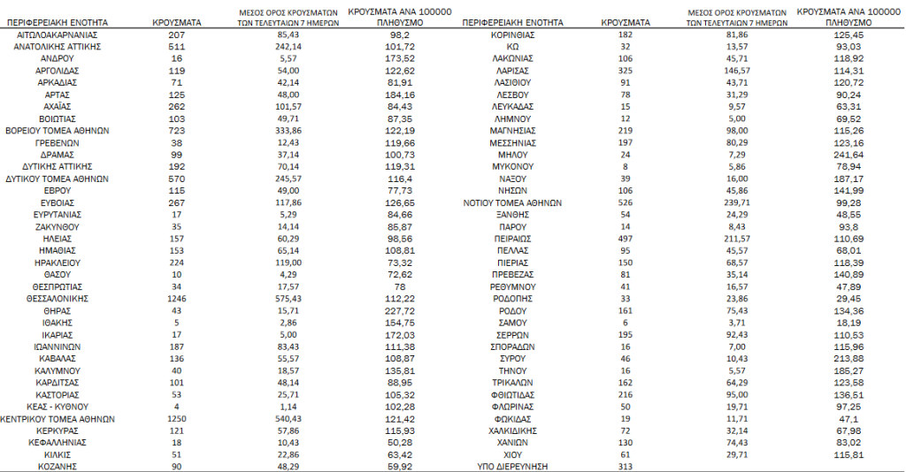 Τα νέα εργαστηριακά επιβεβαιωμένα κρούσματα της νόσου (άτομα) που καταγράφηκαν τις τελευταίες 24 ώρες ήταν 11.487. Ο συνολικός αριθμός των ατόμων που νόσησαν ανέρχεται σε 3.302.382 (ημερήσια μεταβολή +0.3%), εκ των οποίων 48.9% άνδρες.