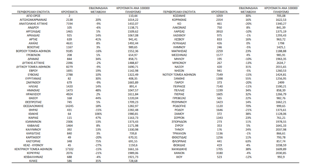 Δείγματα που έχουν ελεγχθεί: Την εβδομάδα αναφοράς, το ποσοστό θετικότητας ήταν 15,56% σε σύνολο 954.188 εργαστηριακών ελέγχων (RT-PCR/Rapid-Ag) με το μέσο όρο επταημέρου να είναι 136.313 δείγματα (4% εβδομαδιαία μεταβολή).