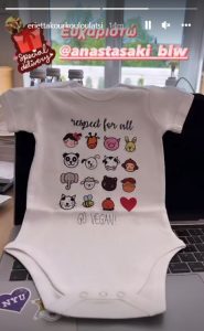 Για τον λόγο αυτό, δημοσίευσε στον προσωπικό της λογαριασμό στο ίνσταγκραμ, ένα φορμάκι του μικρού, πάνω στο οποίο απεικονίζονται τόσο άνθρωποι, όσο και ζωάκια, ενώ αναγράφεται και η φράση: “Respect for all, GO VEGAN”.