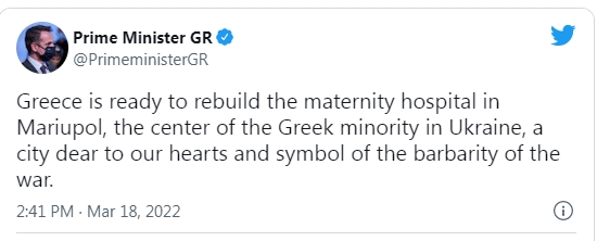 «Η Ελλάδα είναι έτοιμη να ξαναχτίσει το μαιευτήριο στη Μαριούπολη, το κέντρο της ελληνικής μειονότητας στην Ουκρανία, μιας πόλης που είναι μέσα στην καρδιά μας και σύμβολο της βαρβαρότητας του πολέμου» ανέφερε στην ανάρτηση του στο twitter ο κ. Μητσοτάκης.
