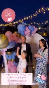 Χθες λοιπόν πραγματοποιήθηκε μια συγκέντρωση προκειμένου να μάθουν ο Μάνος και η Χριστίνα το φύλο του μωρού που περιμένουν. Αφού έσκασαν το μεγάλο μπαλόνι, ροζ χαρτάκια σκορπίστηκαν παντού, υποδεικνύοντας με αυτόν τον τρόπο πως περιμένουν κοριτσάκι.