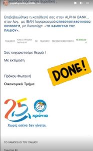 Μετά την επιστροφή της στην Ελλάδα, η επιχειρηματίας, προχώρησε σε μια κίνηση ανθρωπιάς, παραχωρώντας στο “Χαμόγελο του Παιδιού” μέρος από τα κέρδη της, και συγκεκριμένα το ποσό των 10.000 ευρώ.