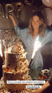 Αρχικά τα πρώτα κεράκια τα έσβησε κατά τη διάρκεια των γυρισμάτων του σίριαλ που πρωταγωνιστεί, καθώς όλοι οι συντελεστές της έκαναν έκπληξη μια πανέμορφη τούρτα, με σκοπό να της ευχηθούν για τα 42α γενέθλια της.